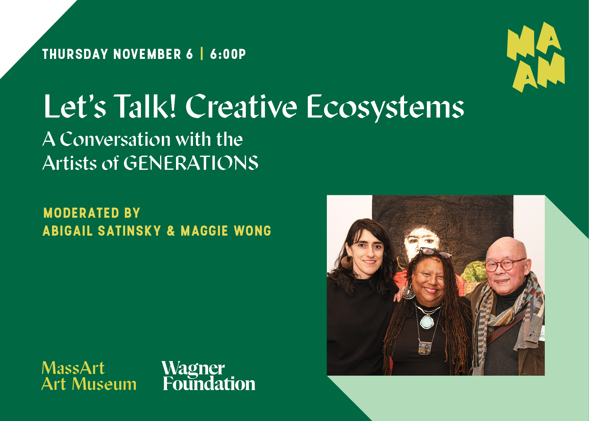 Organized in partnership with Wagner Foundation, MAAM’s current exhibition, GENERATIONS, honors artists deeply engaged in Boston’s creative ecosystem: L'Merchie Frazier, Daniela Rivera, and Wen-ti Tsen. Join the artists in conversation with Abigail Satinsky, Program Officer and Curator, Arts & Culture and Maggie Wong, Gallery Coordinator with Wagner Foundation.