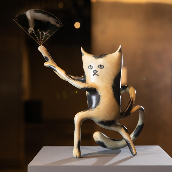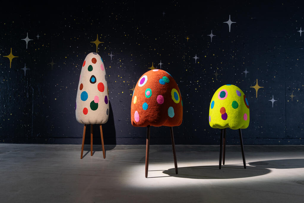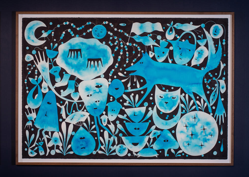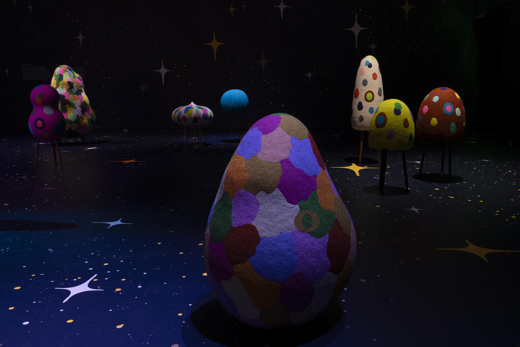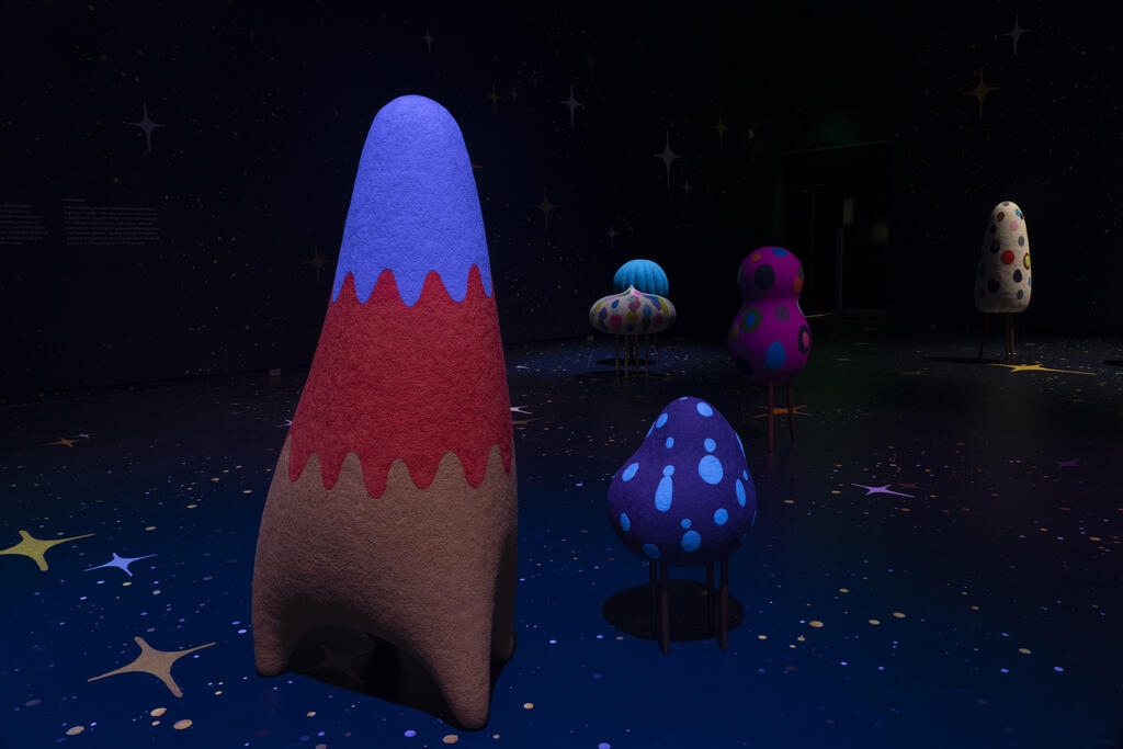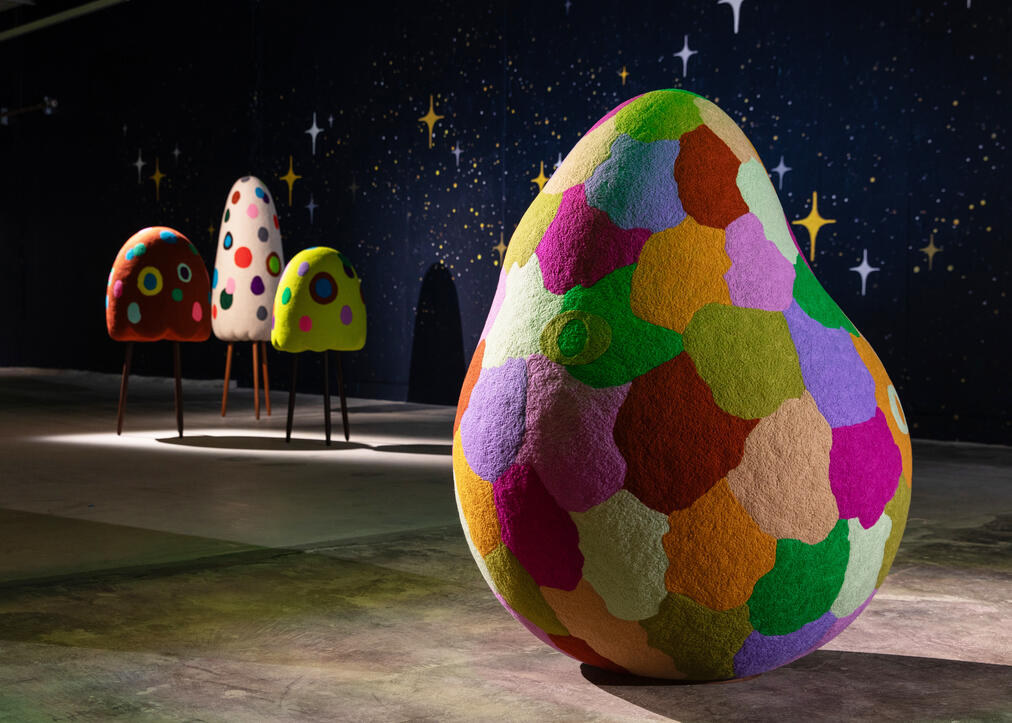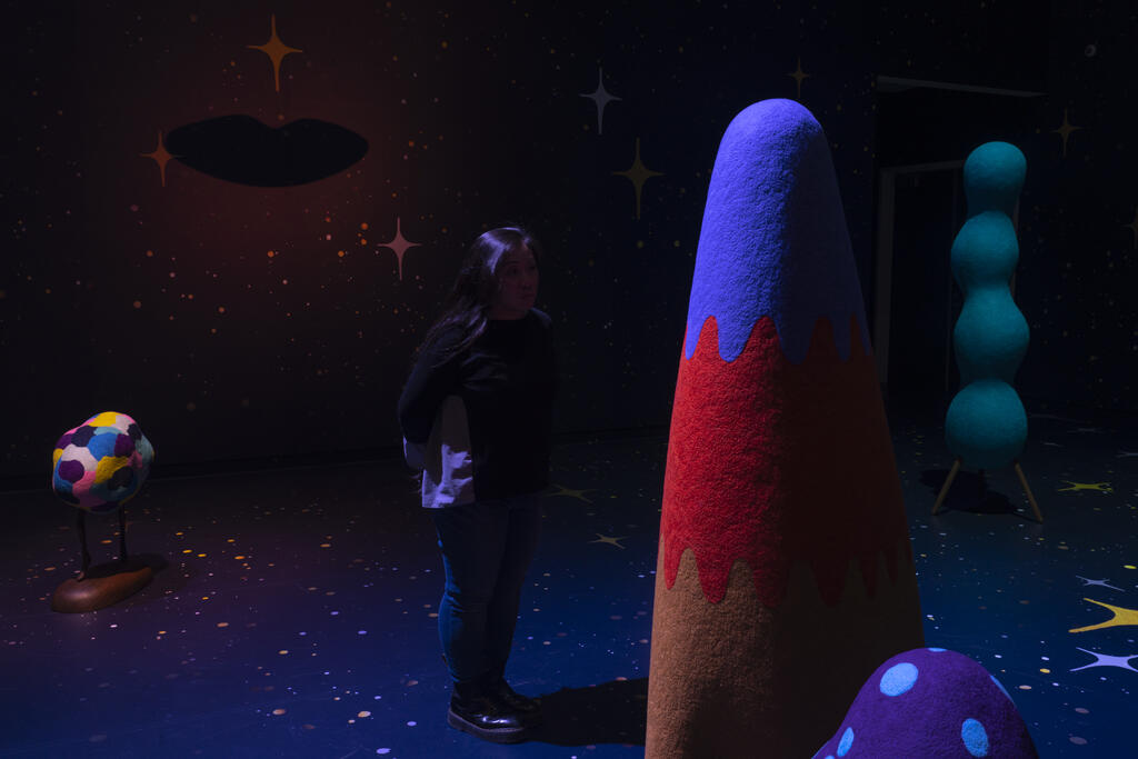 Masako Miki: Midnight March is an experiential world populated by semi-abstracted felted wool sculptures set within a galaxy. Referencing nature, Japanese yōkai (supernatural beings), and Shintoism, Miki creates new mythologies that reflect the complexity of multicultural identities and worlds. Miki’s practice is rooted in the belief that art can generate new, inclusive narratives to counter harmful lore. The artist seeks to bridge cultural divides and foster shared understanding.